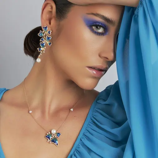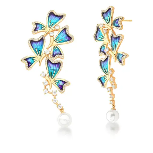 BRINCO PÊNDULO COM BORBOLETAS AZUIS IRIDESCENTE BANHADO A OURO